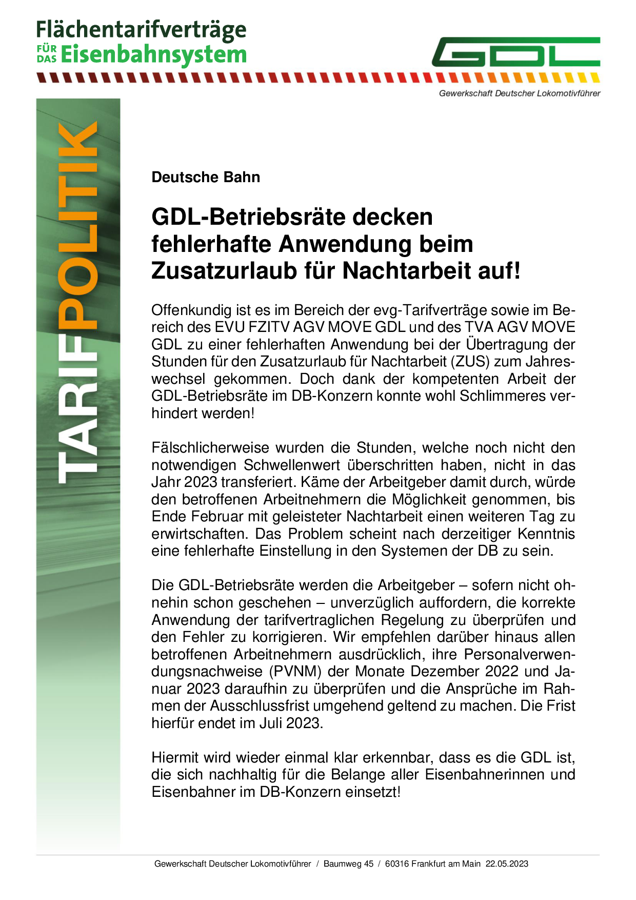 Änderung des GDL Tarifwerks DB